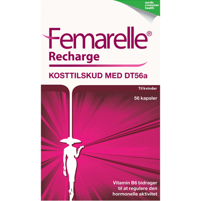 Udover DT56a indeholder Femarelle® Recharge også vitamin B6, som understøtter hormonbalancen, reducerer træthed og bidrager til nervesystemets normale funktion samt et sundt energistofskifte. Produktet inkluderer også hørfrøekstrakt, der er rig på lignaner med hormonlignende egenskaber, som kan have en gavnlig indflydelse på helbredet i overgangsalderen. Lignaner fra hørfrø omdannes i tarmen til stoffer, der kan beskytte og støtte sundt brystvæv, når kvinder bliver ældre.
