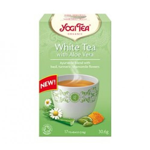 Vores hud afspejler vores indre tilstand. Denne unikke Yogi Tea® er skabt med omhu ved at blande hvid te med aloe vera, blidt krydret gurkemeje og duftende kamilleblomster. Kanel tilføjer en let sødme til teen. Vi kan nyde en rolig stund og pleje vores indre med en kop Yogi Tea® White Tea with Aloe Vera.