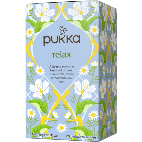 Relax te består af ingredienser som kamille, fennikel og lægestokroseblomst. Denne te er ideel til en afslappende dag eller aften. Perfekt til en hyggelig stund. Vinder af guld ved "Great Taste Awards". Urte- og krydderteer er naturligt koffeinfri.