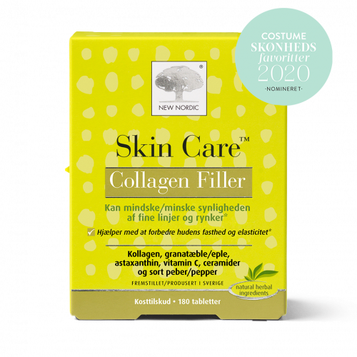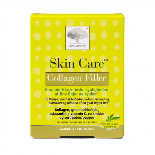 Hudpleje™ tabletter indeholder maritimt kollagen, som ligner det, der findes naturligt i hudens elastiske væv, samt et standardiseret ekstrakt af granatæble, tomat og naturlig astaxanthin. Hudpleje er beriget med C-vitamin, som medvirker til normal kollagendannelse, hvilket er vigtigt for hudens normale funktion og kollagenproduktion. Derudover bidrager det til at beskytte cellerne mod oxidativt stress, såsom solens aldrende UV-stråler. En velfungerende hud kan bevare sin fugtighed.