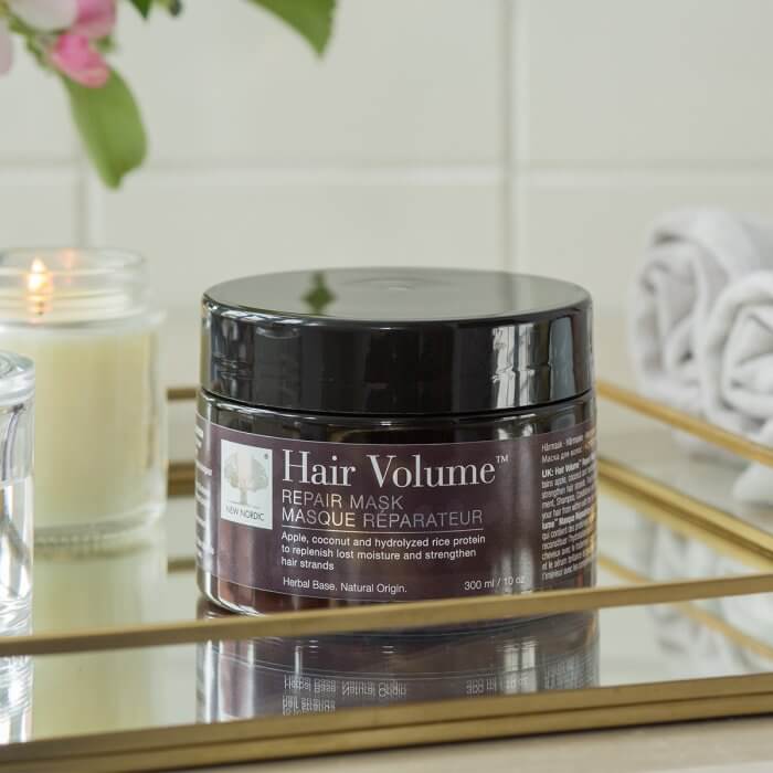 Hair Volume™ Repair Maske indeholder ingredienser som æble, kokos og hydrolyseret risprotein, der medvirker til at genoprette hårets fugtbalance og styrker hårstråene. For at opnå det bedste resultat anbefales det at anvende Repair Mask sammen med de andre produkter i Hair Volume™ serien.