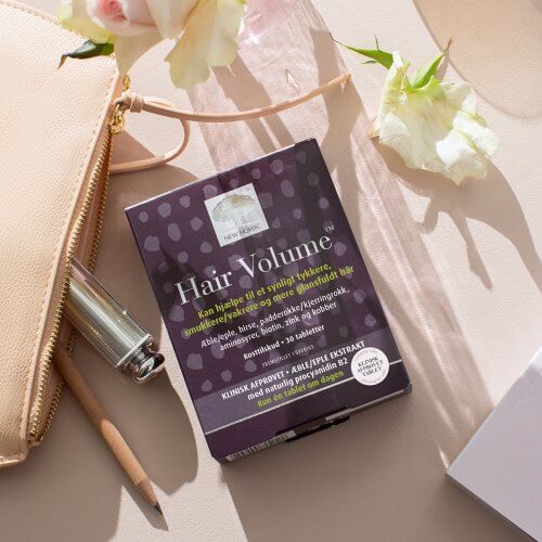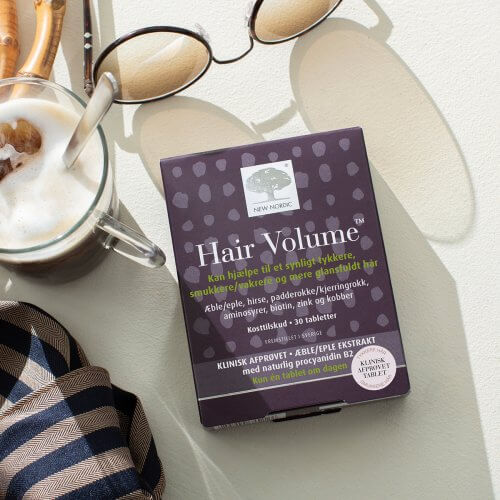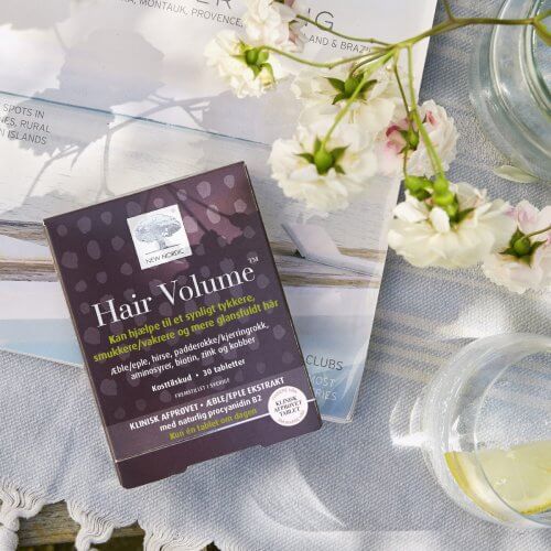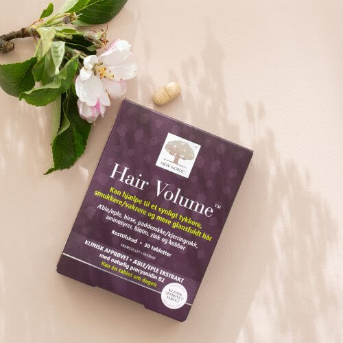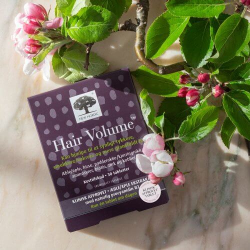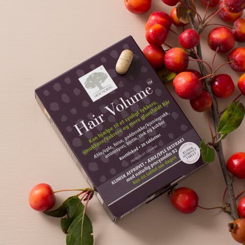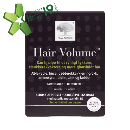 Hair Volume™ er en tablet baseret på æbleekstrakt kombineret med hirse, padderokke, aminosyrer, biotin, zink og kobber. Denne tablet leverer vigtige næringsstoffer til hovedbunden og hårsækkene, hvor håret skabes. Biotin og zink medvirker til normal hårvækst og understøtter hudens normale funktioner. Zink har også en positiv indflydelse på vedligeholdelse af normale negle. Kobber spiller en rolle i produktionen af hårpigment, hvilket bevarer hårets naturlige farve.