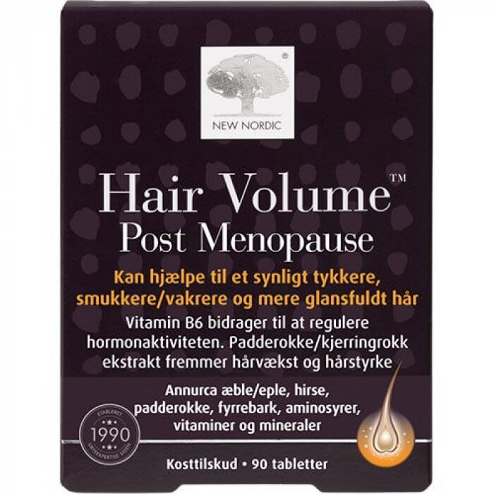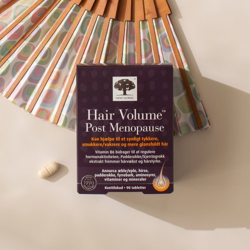Hair Volume™ Post Menopause er udviklet med en klinisk testet hårtablet, der fremmer et fyldigere, smukt og glansfuldt hår. Mange oplever, at hormonelle ændringer med alderen kan påvirke hårets kvalitet. Hair Volume™ Post Menopause indeholder et ekstrakt fra annurca æble med naturlig procyanidin B2. Tabletten har samme ingredienser som den originale Hair Volume™ samt B-vitaminer og maritim fyrrebark. Hair Volume™ Post Menopause indeholder B6-vitamin, som medvirker til at regulere hormonaktiviteten. Zink og biotin understøtter vedligeholdelsen af normalt hår og hud. Padderokkeekstrakt bidrager til at understøtte hårvækst og styrke. Padderokke og zink medvirker også til at opretholde normale negle. Kobber støtter en normal pigmentering af håret.