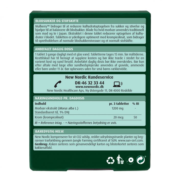 Mulberry™ medvirker til at mindske optagelsen af kulhydrater fra sukker og stivelse, hvilket understøtter en stabil blodsukkerbalance. I Japan bruges blade fra hvid morbær traditionelt som føde og te. Ekstrakten i denne tablet mindsker kulhydratoptagelsen i blodet. Tabletten er yderligere forbedret med krompicolinat, som bidrager til at vedligeholde normale blodsukkerniveauer samt normal forbrænding af fedt, kulhydrater og proteiner.